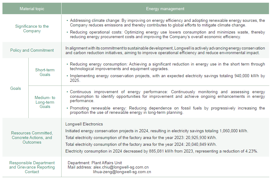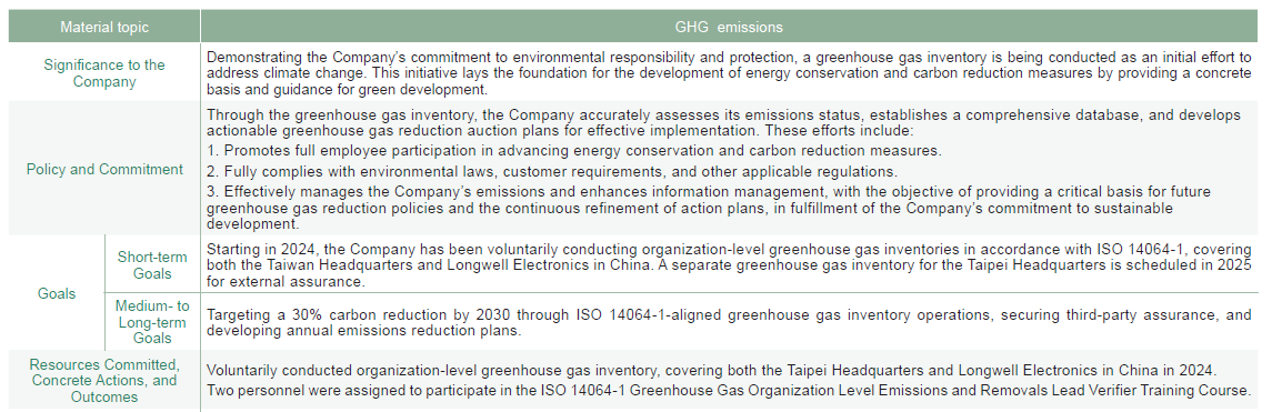 Greenhouse gas emissions are a key driver of climate change and represent a critical global environmental challenge. Though not a major energy consumer, Longwell acknowledges its responsibility as a global corporate citizen and recognizes that reducing greenhouse gas emissions is a shared responsibility and a common goal among enterprises. In 2024, Longwell voluntarily conducted greenhouse gas inventory in accordance with ISO 14064-1. In parallel, Longwell Electronics (Shenzhen factory) initiated its greenhouse gas inventory in compliance, with local government regulations and engaged third-party assurance bodies to conduct annual assurances. These inventories enable the Company to accurately assess its current emissions status and take proactive measures.