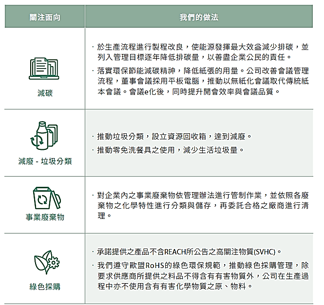 1.公司取得環境管理系統 ISO 14001(有效期限:2024.06.11-2027.07.05)、ISO 45001 (有效期限:2024.06.11-2027.07.05)之認證,並依上述環境管理系統要求執行。