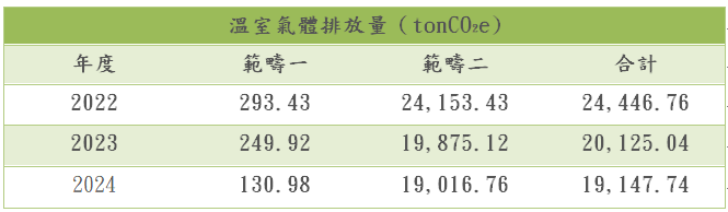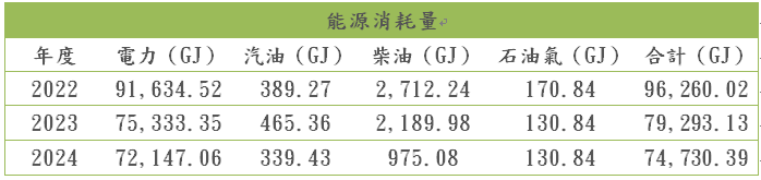 1.公司主要耗能來自於外購電力,以及叉車、宿舍供熱水之柴油及公務車汽油。最近 2年主要排放源為外購電力,占整體排放量 99%以上,其餘為固定排放源(叉車、宿舍供熱水之柴油)、移動排放源(公務車之汽油)。2024年致力於能源使用結構的改善,並取得成效。