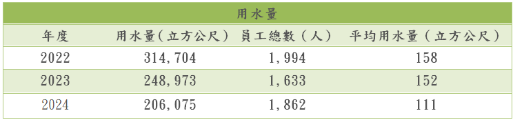 2.公司長年關注水資源節能環保議題,在節水計畫方面,從全面落實日常生活節約用水做起,將可利用之水資源發揮更大效益。2022年我們用水量為314,704立方公尺,取水來源為自來水(100%), 2023年我們加強雨水回收、空調冷凝水與冷卻水回收,努力達到平均用水量相較2022年有響應的節省,本公司仍將持續思考水資源回收與再探討進化方式, 提升整體用水效率,于2024年止,用水效率大幅提升。