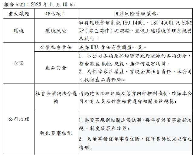 依照公司整體營運方針進行與公司營運相關之環境、社會及公司治理議題之風險評估,訂定相關風險管理策略。